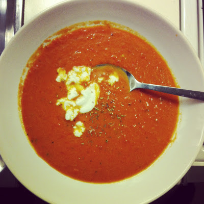 Roast the cherry tomatoes with some garlic and olive oil in the oven for about 10 minutes. It gives the soup a more deep flavour! Take the chopped onion and fry it in olive oil, thyme and basil until it softens. If you fry the seasoning with the garlic, it gives a strong flavour to the soup! Throw in the cherry tomatoes, the peeled tomatoes, a cup of water (and a dash of white wine if you happen to have it at home), a spoon of sugar and some vegeatble broth. You can also add some chopped garlic. Let it boil softly for 20-30minutes. Then mix the soup with a blender, add some cream and let it boil for another 5minutes. Garnish with more basil and thyme, Chevré Cheese and serve with bread! YUM!!
